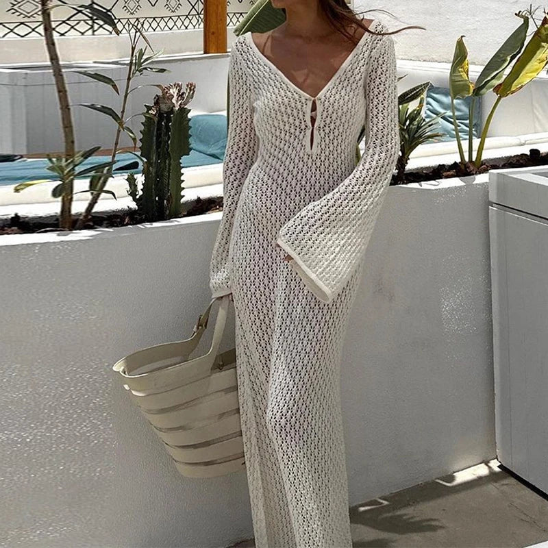 Bohemian V-Neck Hollow Out Maxi Dress – Flare Sleeve Summer Style